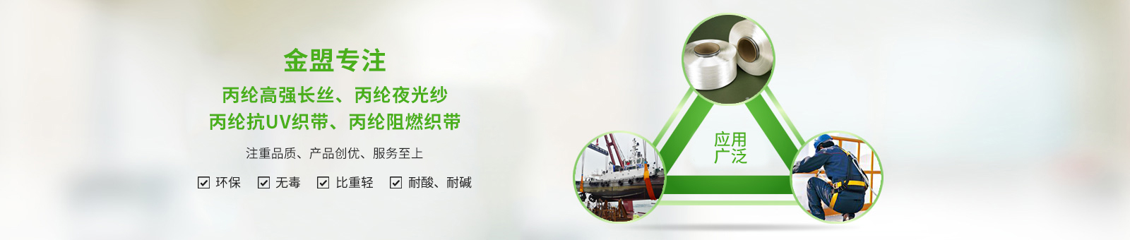 高強(qiáng)丙綸絲具有環(huán)保、無(wú)毒、耐酸、耐堿、比重輕、熱收縮率小、導(dǎo)熱性低、靜電積蓄少、幾乎不吸濕等優(yōu)點(diǎn),產(chǎn)品在產(chǎn)業(yè)用絲方面具有很大潛力,可廣泛用于工業(yè)吊帶、安全帶、輸送帶、機(jī)織土工布、過(guò)濾布、蓬帆布、制線(xiàn)、繩纜、電纜等行業(yè)等方面,是部分替代錦綸、滌綸的新穎紡織材料。